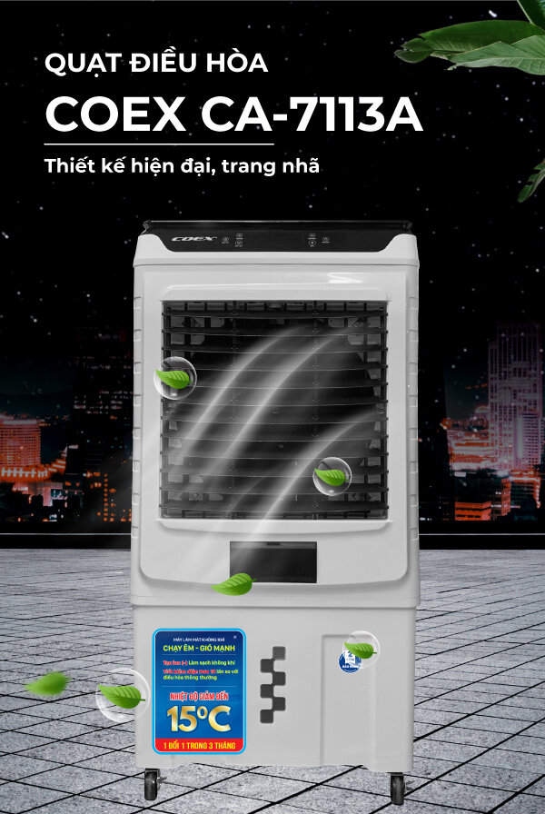 Thiết kế sang trọng, trang nhãQuạt điều hòa Coex CA-7113A có kiểu dáng sang trọng, màu sắc trang nhã nổi bật, kích thước nhỏ gọn, tiết kiệm diện tích, phù hợp với nhiều không gian khác nhau.