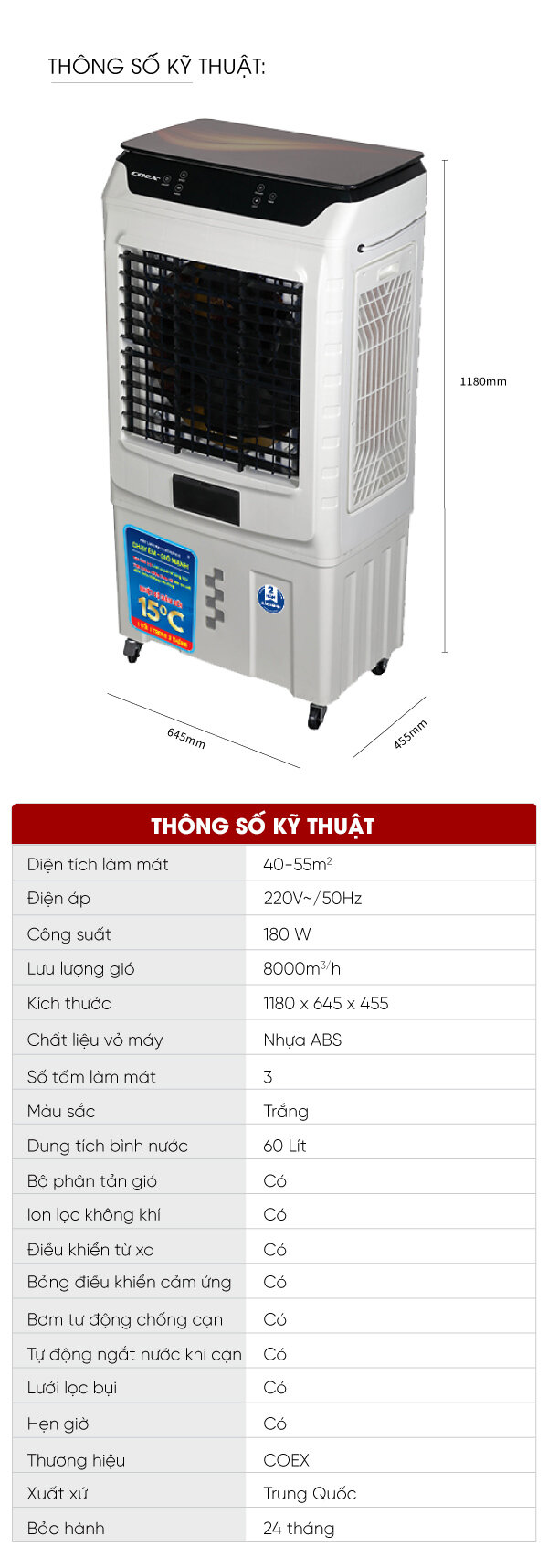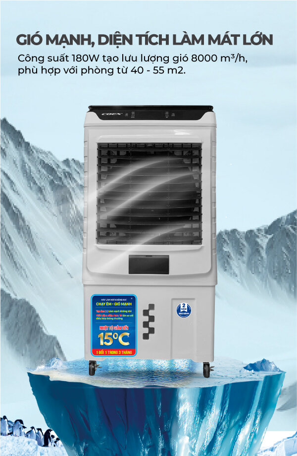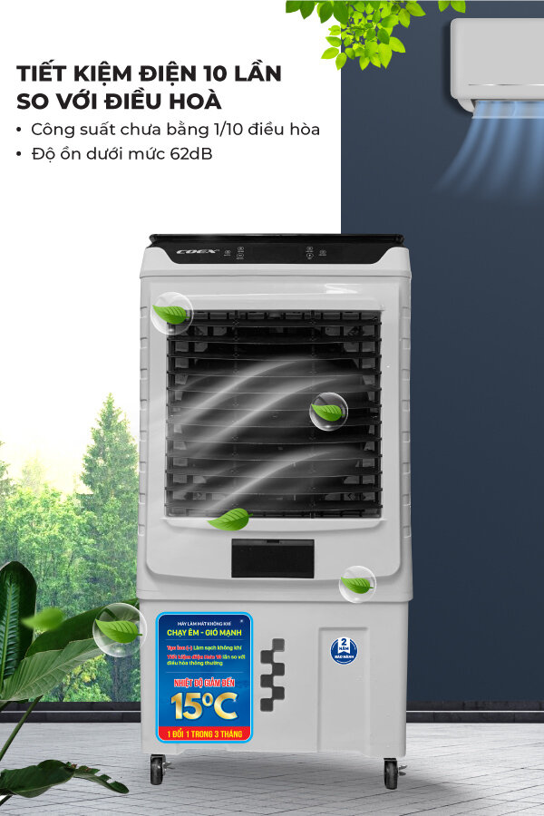 Gió mạnh, diện tích làm mát lớn Quạt điều hòa Coex có công suất 180W tạo lưu lượng gió 8000 m³/h, phù hợp với phòng từ 40-55 m2, nhanh chóng làm mát không gian mở như nhà hàng, nhà xưởng, khách sạn...