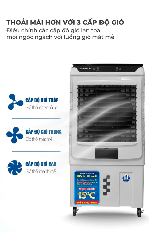 3 mặt lấy gió, lưu lượng gió cực lớn, cánh đảo gió 2 chiều tự động, kết hợp đá khô tăng diện tích làm mát. Khi mua quạt điều hòa Coex, khách hàng được tặng kèm 2 cục đá khô giúp giảm nhiệt độ đáng kể.