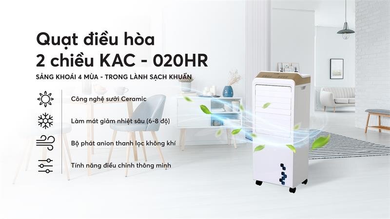 Nổi bật với công suất lọc vượt trội, quạt điều hòa 2 chiều KAC - 020 HR vừa có khả năng làm mát diện rộng vừa có chế độ sưởi ưu việt phù hợp vơi thời tiết quanh năm tại Việt Nam. Máy di chuyển linh hoạt, công nghệ tạo ẩm ICE GEL BOX với chế độ tạo anion có lợi, đem đến bầu không khí sảng khoái tươi mới cho cả gia đình.