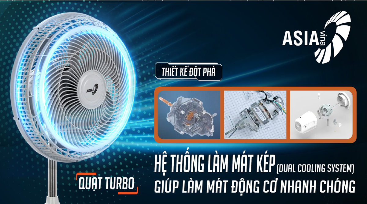 Thiết kế đột phá Thiết kế quạt 6 cánh và lồng xoắn ốc giúp đẩy mạnh tốc độ gió. Hệ thống làm mát kép (Dual Cooling System) giúp làm mát động cơ nhanh chóng.