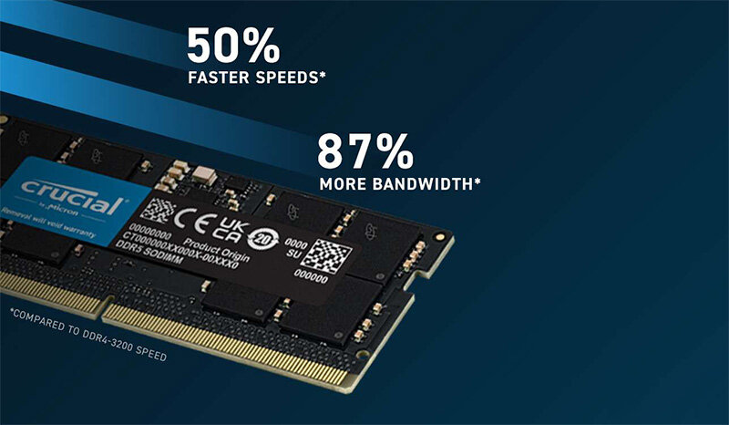 Ram Laptop Crucial DDR5 phá vỡ mọi giới hạn tốc độ của DDR4 khi bị thắt cổ chai. Cải thiện hiệu suất máy tính, tiết kiệm năng lượng hơn và dung lượng lớn hơn rất nhiều, hỗ trợ tất cả các dòng vi xử lý thế hệ mới nhất
