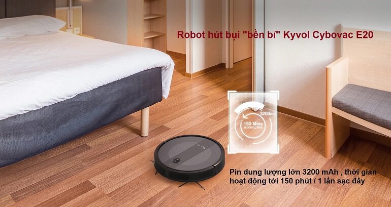 Với pin 3200mAh mạnh mẽ, Cybovac E20 có thể chạy tới 150 phút và làm sạch diện tích lên tới 100 mét vuông trong một lần sạc. Robot hút bụi từ Kyvol có loại pin tốt nhất, rất chắc chắn và có một số biện pháp bảo vệ pin để đảm bảo sản phẩm được an toàn và sử dụng lâu dài.