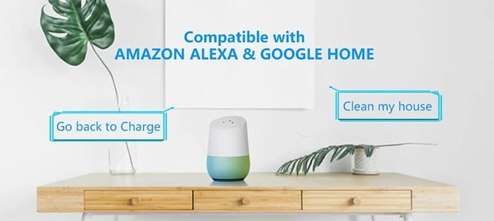 Tính năng kết nối cùng trợ lý ảo Google Home và Amazon Alexa, bạn có thể ra lệnh cho robot làm việc, ngừng hoặc quay về đế sạc bằng giọng nói sau khi kết nối robot với các trợ lý ảo này.