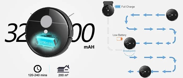 W800 trang bị pin LG Lithium có dung lượng lớn 3.200mAh cho thời gian hoạt động lên đến 120 - 240 phút. Khi dung lượng pin còn khoảng 20%, robot sẽ tự động quay về đế sạc và bắt đầu sạc pin, chuẩn bị sẳn sàng cho lần làm việc tiếp theo.