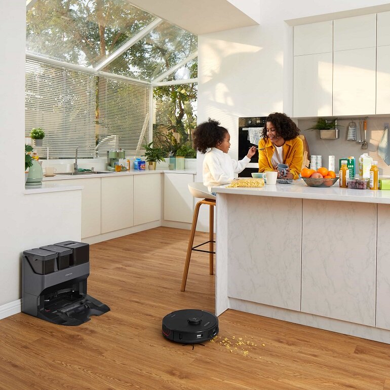 Đế dễ sử dụng có thể sạc ba thiết bị cùng một lúc; thùng rác tự làm sạch bằng công nghệ thông minh.