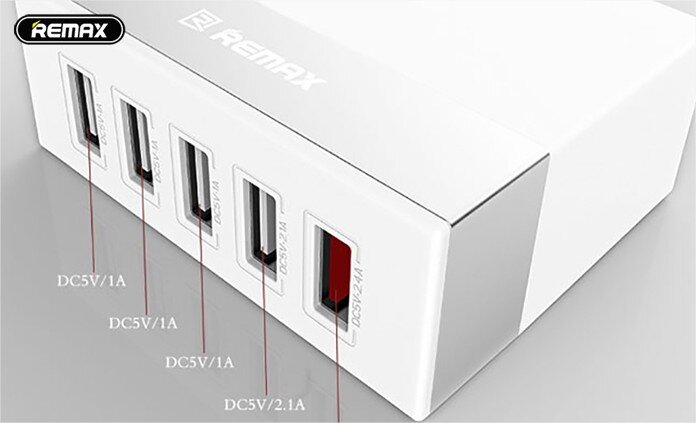 Thiết kế củ sạc đa năng - tiện dụng Với thiết kế 5 cổng USB, bạn có thể sử dụng sạc 5 thiết bị cùng 1 lúc với củ sạc Remax này. Đặc biệt, các cổng USB có nguồn ra khác nhau, 3 cổng 5V-1A, 1 cổng 5V-2.1A, bạn có thể lựa chọn cổng theo điện áp mà thiết bị mình phù hợp để sạc.
