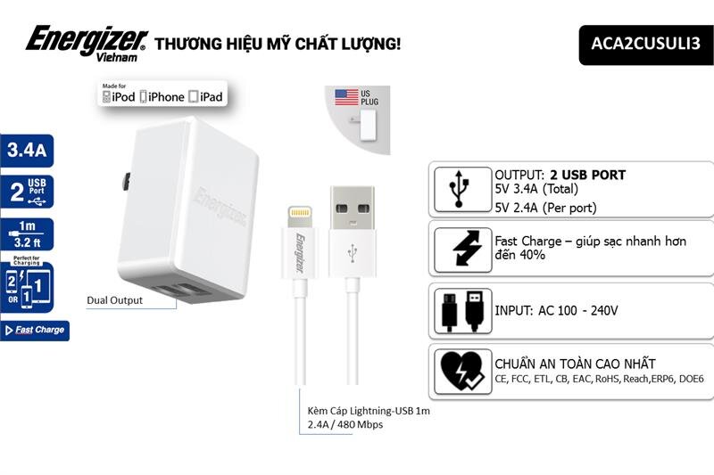 Giới thiệu: Sạc Energizer 3.4A 2USB màu trắng kèm cáp Lightning - ACA2CEUULI3