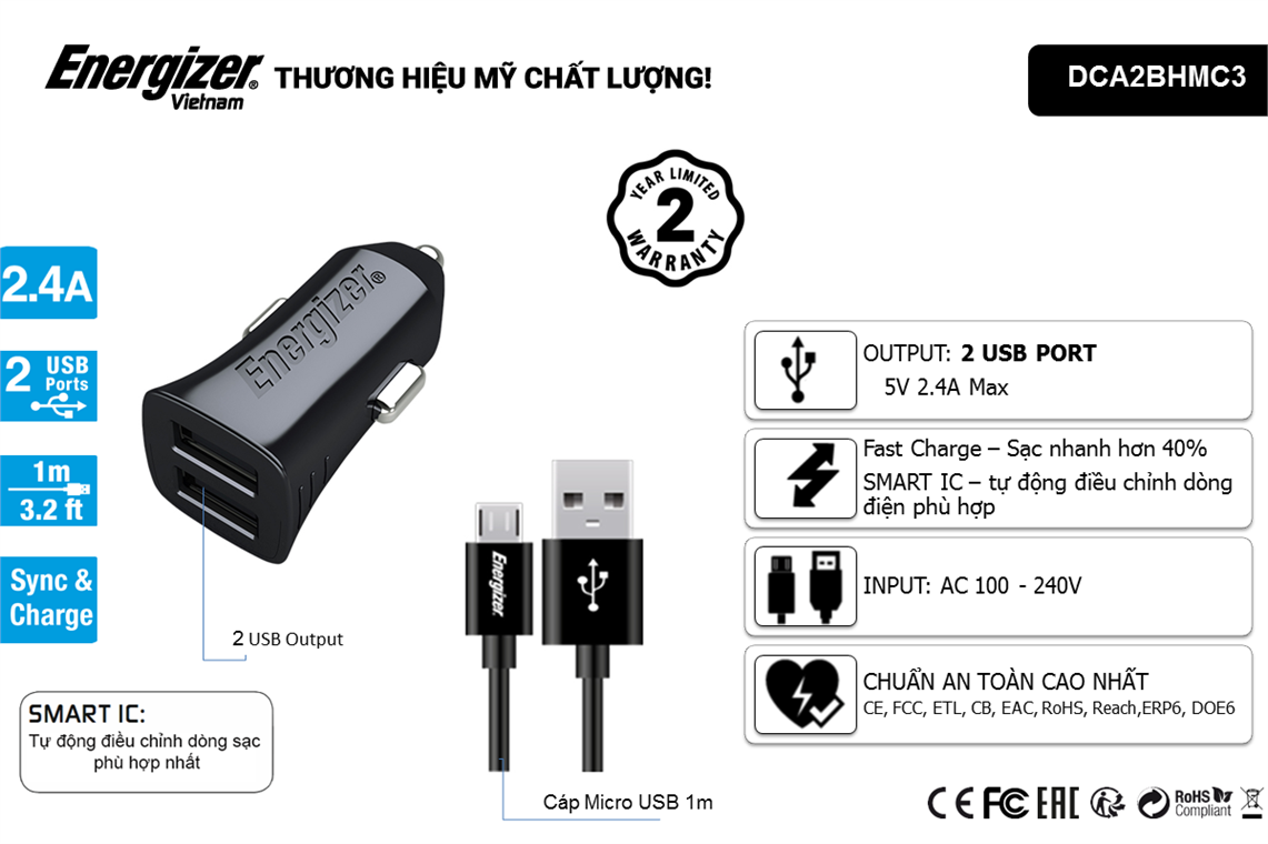 Sạc ô tô Energizer tích hợp công nghệ Fast Charge - giúp sạc nhanh hơn 40% so với chuẩn sạc thông thường Sạc ô tô Energizer được trang bị 2 cổng USB output, giúp sạc cùng lúc 2 thiết bị. Chuẩn sạc 5V – 2.4A, sạc ô tô Energizer không chỉ sạc được cho smartphone mà còn hỗ trợ sạc được cho các dòng tablet trên thị trường. Đặc biệt, với output 5V 2.4A max giúp thiết kiệm thời gian sạc lên đến 40%. Thiết kế nhỏ gọn, thuận tiện cho việc mang theo khi di chuyển Sạc ô tô Energizer được thiết kế vô cùng nhỏ gọn giúp việc cất giữ hay mang theo dễ dàng mà không chiếm quá nhiều không gian túi đồ của bạn. Smart IC - tương thích an toàn với mọi thiết bị. Sạc ô tô Energizer 2.4A 2USB được trang bị công nghệ Smart IC cho phép tự động điều chỉnh dòng điện phù hợp cho việc sạc smartphone hoặc tablet. Không chỉ vậy, công nghệ Smart IC còn giúp cho dòng điện luôn nằm trong ngưỡng an toàn mà thiết bị cho phép, tránh gây quá tải hoặc gây hư hại cho thiết bị khi sạc Tiêu chuẩn Châu Âu về an toàn & chống cháy nổ