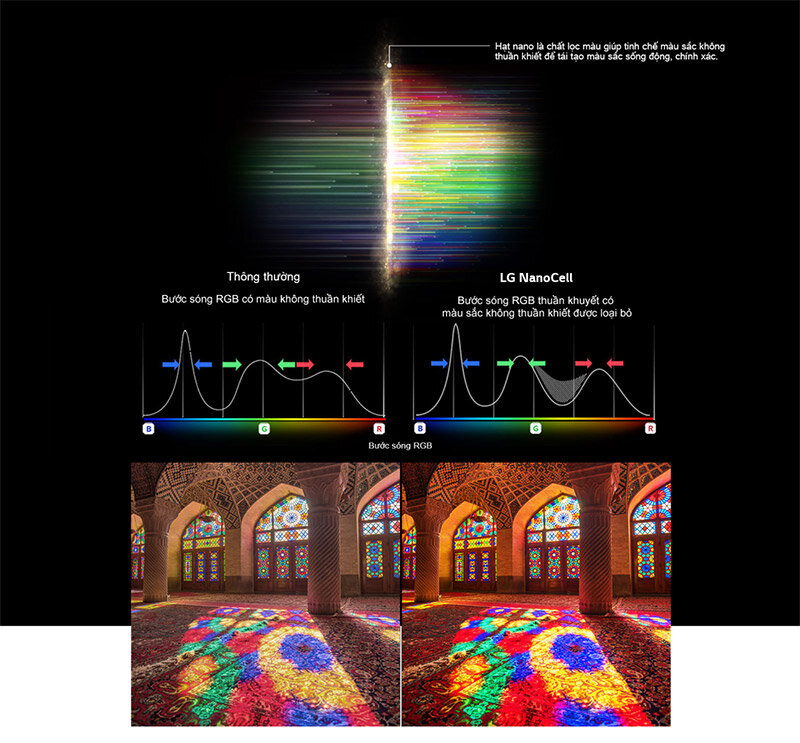 Màu sắc RGB thuần khiết là chìa khóa cho chất lượng hình ảnh trung thực. Công nghệ NanoCell sử dụng hạt nano để lọc màu bằng cách lọc bỏ các màu xỉn và tạo độ thuần khiết của phổ RGB.