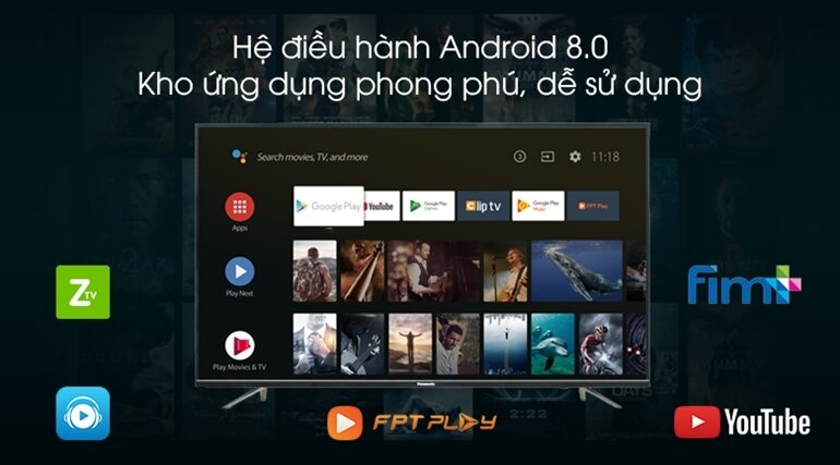 Smart tivi 4K TH-49FX550V không chỉ sở hữu hệ điều hành Android 8.0 với nhiều tính năng thông minh hữu ích mà còn được trang bị kho ứng dụng Google Play khổng lồ (YouTube, FPT Play, Karaoke +, Nhạc của tui, Spotify, Film+) giúp bạn xem phim, nghe nhạc, lướt web sau những giờ làm việc căng thẳng.