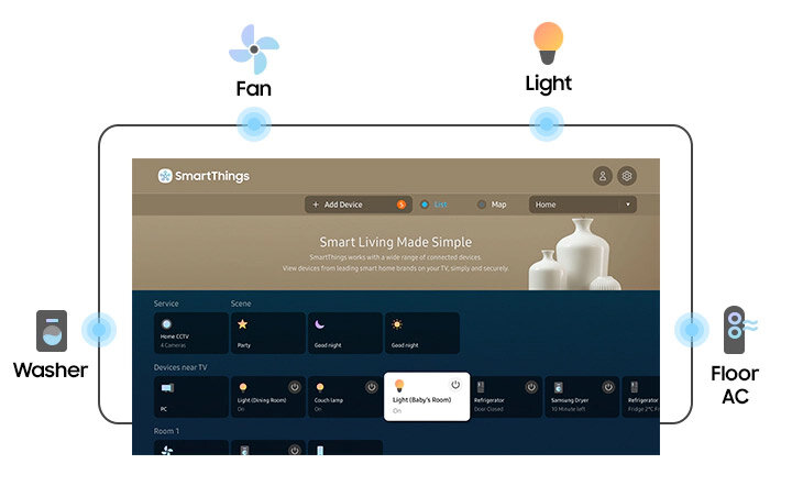 SmartThings - Cho phép của bạn tự động phát hiện, kết nối ngay lập tức và hiển thị trực quan tất cả các thiết bị xung quanh TV của bạn. Digital Butler không chỉ hỗ trợ thiết bị di động / cam / IoT / Smart mà còn bao gồm các thiết bị cũ. Bạn có thể điều khiển thiết bị trực tiếp bằng remote hoặc giọng nói khi xem TV.