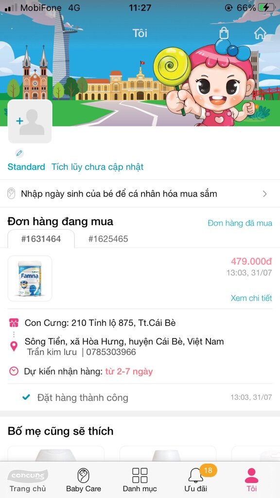 Dạ, đơn hàng 1631464 mình đặt 31/7 Con Cưng đã tiếp nhận thông tin và chuyển cho bộ phận giao hàng để hỗ trợ giao cho mình từ 3 - 7 ngày không tính thứ 7 và chủ nhật ạ. Con Cưng xin cảm ơn.