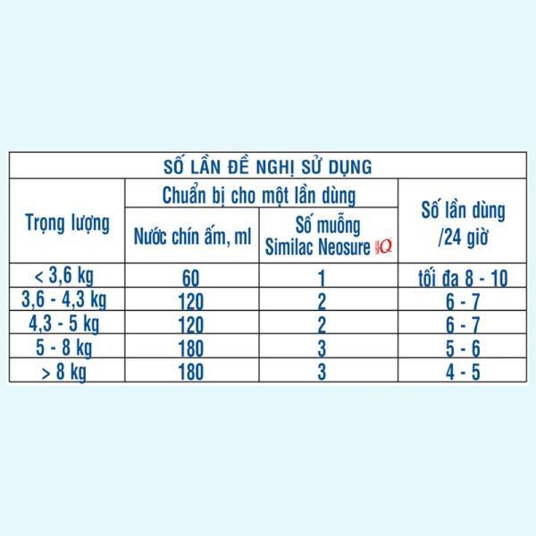 . Dùng nước đã được đun sôi trong vòng 5 phút và để nguội (37ºC) để pha chế theo hướng dẫn.. Chỉ dùng muỗng có sẵn trong hộp để lường Similac Neosure IQ.. Lượng pha dư hơn 1 lần uống phải bảo quản trong tủ lạnh ở 2 - 4ºC không quá 24 giờ.. Cách pha chuẩn: một muỗng gạt ngang Similac NeoSure IQ pha với 60ml nước, hoặc 145g bột trong mỗi lít nước, 30ml sữa cung cấp 22kcal.