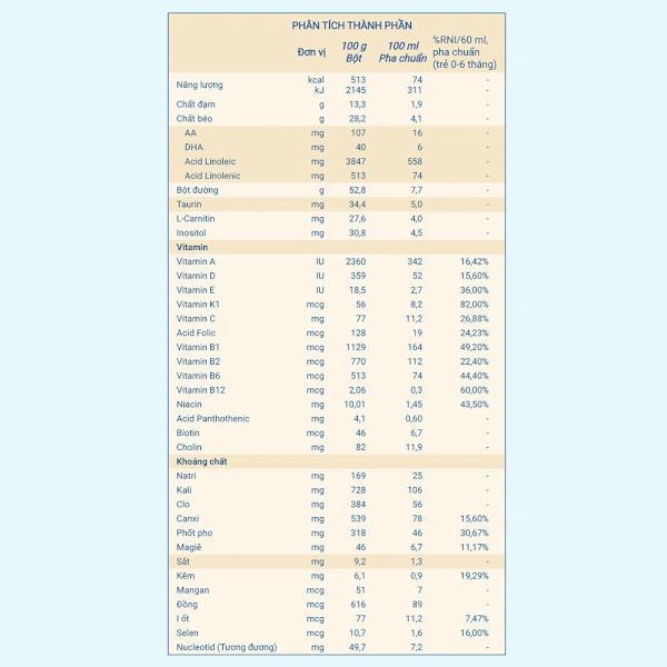 Maltodextrin, Dầu thực vật (chứa: dầu đậu nành, dầu hướng dương giàu oleic, dầu MCT (triglycerid chuỗi trung bình), dầu dừa), sữa không béo, lactose, đạm whey cô đặc, Khoáng chất (canxi carbonat, kali phosphat, kali hydroxid, tricanxi phosphat, natri clorid, magiê clorid, sắt sulfat, kẽm sulfat, đồng sulfat, mangan sulfat, kali iodid, natri selenat), acid arachidonic (AA), Vitamin (natri ascorbat, acid ascorbic, ascorbyl palmitat, niacinamid, d-alpha tocopheryl acetat◊, canxi d-pantothenat, vitamin A palmitat, thiamin hydroclorid, riboflavin, pyridoxin hydroclorid, acid folic, phylloquinon, d-biotin, cholecalciferol, cyanocobalamin), 2'-fucosyllactose (2'-FL HMO) (oligosaccharid), chất nhũ hóa lecithin, acid docosahexaenoic (DHA), Nucleotid (cytidin 5’-monophosphat, dinatri uridin 5’-monophosphat, dinatri guanosin 5’-monophosphat, adenosin 5’-monophosphat), cholin clorid, taurin, L-carnitin, myo-Inositol, hỗn hợp tocopherol, Carotenoid (beta caroten).