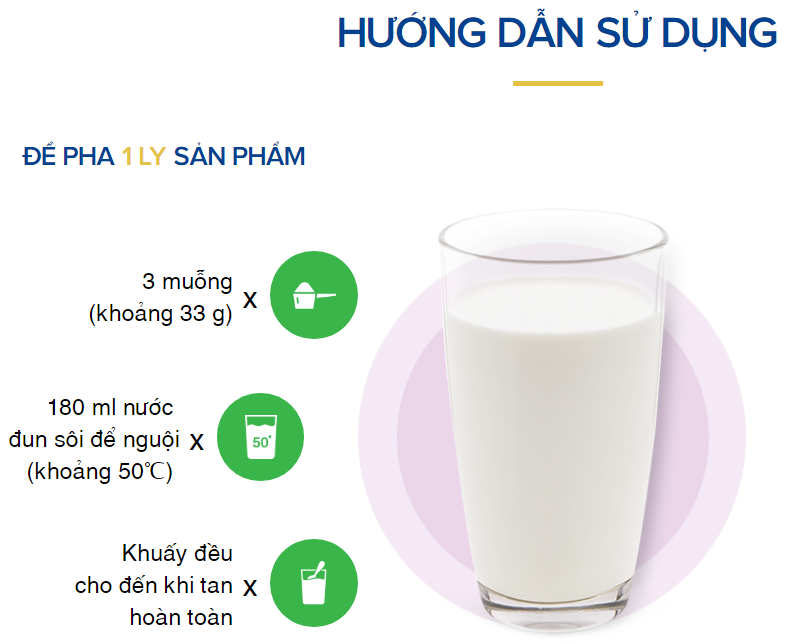 Pha 3 muỗng Vinamilk CanxiPro (khoảng 33 g) vào ly nước ấp 180 ml (khoảng 50 độ C) đã được đun sôi để nguội. Khuấy đều cho đến khi tan hoàn toàn.