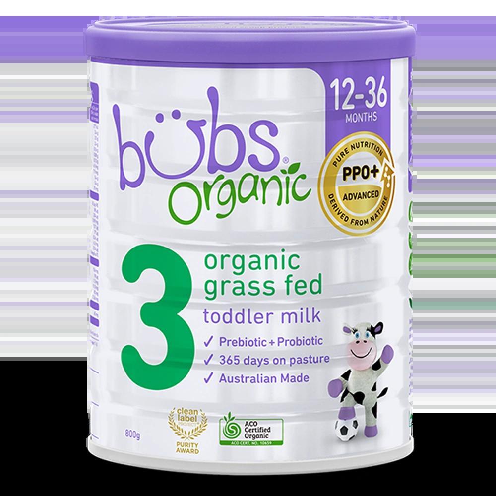 Sản phẩm dinh dưỡng công thức cho trẻ từ 12-36 tháng tuổi Bubs Organic Grass Fed Toddler Milk 3 được sản xuất bằng sữa hữu cơ từ những chú bò ăn cỏ của Úc. Công thức sữa Bubs Organic cân bằng dinh dưỡng, không chứa GMO, tiêu chuẩn sản xuất đảm bảo an toàn, chất lượng, độ tinh khiết và dinh dưỡng.