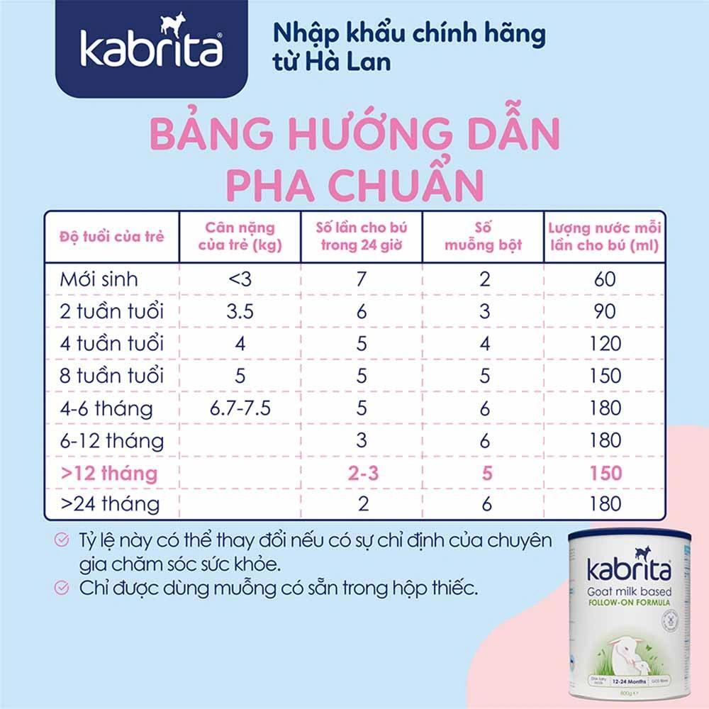 .Pha sản phẩm không quá 1 giờ trước khi cho trẻ uống..Rửa tay thật sạch trước khi pha sản phẩm..Rửa tay thật sạch trước khi pha sản phẩm và dùng dụng cụ pha sản phẩm đã được vệ sinh sạch sẽ..Cho vào cốc đúng lượng nước đun sôi, để nguội xuống còn khoảng 40 °C..Cho 06 muỗng sản phẩm dinh dưỡng công thức từ sữa dê Kabrita dành cho trẻ 24 tháng tuổi trở lên vào 180ml nước..Lắc đều cho đến khi tan hết bột. Kiểm tra nhiệt độ ở mặt trong cổ tay của bạn.Pha sản phẩm không quá 1 giờ trước khi cho trẻ uống.