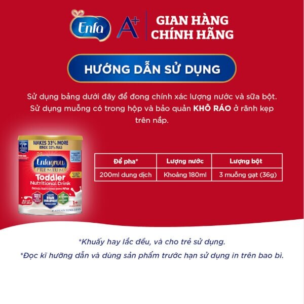 Cho 3 muỗng gạt bột sữa Enfagrow Premium Toddler (36g) vào 180ml nước. Lắc đều và dùng ngay