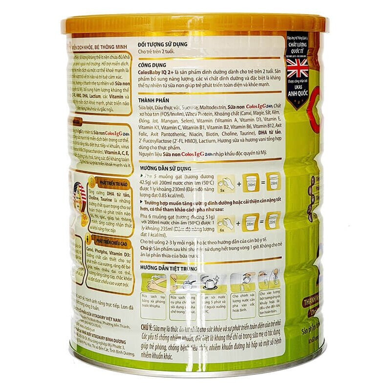 Colosbaby IQ Gold 2+ là dòng sản phẩm sữa thuộc công ty VitaDairy chuyên sản xuất các dòng sữa dinh dưỡng cao cấp bằng tất cả kiến thức, tình yêu, sự trân trọng và trách nhiệm đối với khách hàng và cộng đồng. Sản phẩm sữa Colosbaby IQ Gold 2+ đang được các mẹ rất quan tâm nhờ vào công dụng sữa phù hợp với tiêu chí phát triển của trẻ em Việt Nam. Sữa Colosbaby IQ Gold 2+ 800g là sự lựa chọn tốt cho hệ miễn dịch của các bé từ 2 tuổi trở lên, bổ sung thêm nhiều dưỡng chất quý có giá trị sinh học rất cao: DHA từ tảo thiên nhiên, 2’FL-HMO, Lactimum có nhiều trong sữa mẹ giúp cho sản phẩm đã tốt nay còn tốt hơn.