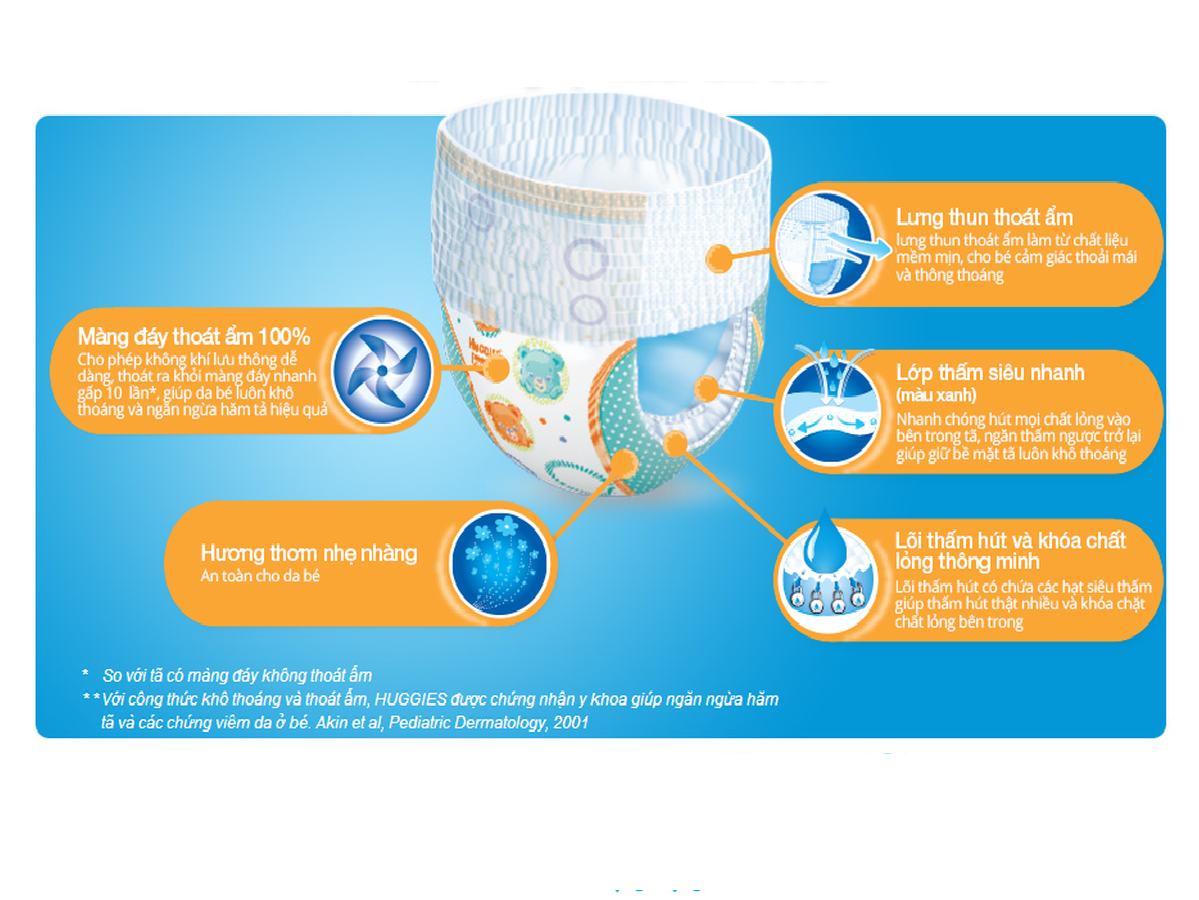 - Màng đáy thoát ẩm 100% giúp không khí được lưu thông và thoát khỏi màng đáy dễ dàng, giúp da Bé khô thoáng, dễ chịu và làm giảm tình trạng hăm tã.
