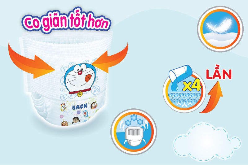 - Mặt ngoài miếng Tả Quần Goo.n Friend Super Jumbo được thiết kế với màu sắc sinh động, thu hút cùng hình ảnh chú mèo máy Doremon cùng các bạn rất đáng yêu, ngộ nghĩnh, chắc chắn sẽ khiến bé vô cùng thích thú, không còn ngại và sợ mặc tả