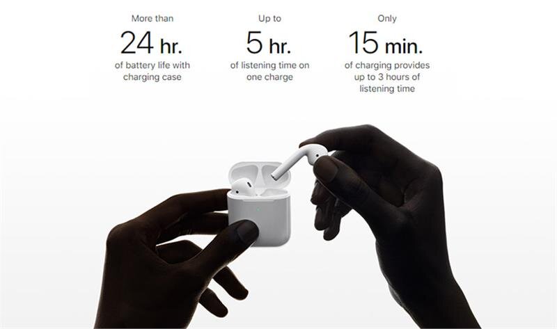 AirPods 2 cung cấp tới 5 giờ nghe nhạc và lên đến 3 giờ đàm thoại, chỉ trong một lần sạc. Hộp sạc đi kèm tai nghe cho phép người dùng sạc nhiều lần, cho thời lượng phát tổng cộng lên đến hơn 24 giờ nghe. Thêm vào đó, thiết bị cũng hỗ trợ tính năng sạc nhanh, bạn chỉ cần bỏ ra 15 phút sạc là có được tới 3 giờ nghe nhạc và 2 giờ đàm thoại. Để kiểm tra pin còn lại của thiết bị, hãy đặt AirPods 2 của bạn bên cạnh iPhone hoặc hỏi Siri “How’s the battery on my AirPods?”