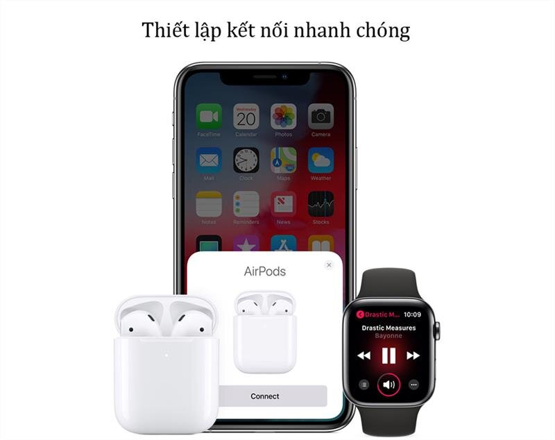 AirPods 2 cho khả năng kết nối ngay lập tức với iPhone hoặc Apple Watch của bạn và chuyển đổi giữa các thiết bị một cách nhanh chóng. Chỉ cần đặt 2 thiết bị gần nhau là chúng sẽ nhận diện được nhau và yêu cầu bạn kết nối. Còn nếu bạn muốn nghe trên máy tính Mac hoặc trên iPad? Chỉ cần chọn AirPods trên các thiết bị đó. Do vậy, việc kết nối trên AirPods với các thiết bị dùng hãng Apple rất đơn giản mà bạn không phải mất công dò tìm nhiều như khi bạn sử dụng các thương hiệu khác.