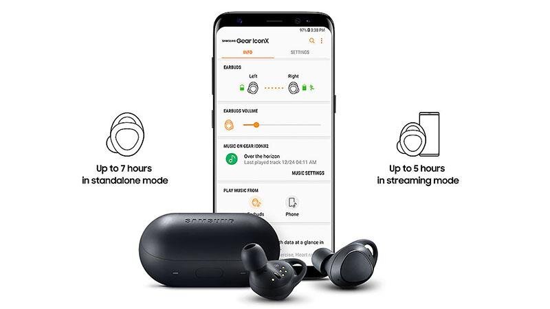 Gear IconX (2018) có thể nghe nhạc đến 5 tiếng liền qua Bluetooth và 7 giờ chơi nhạc độc lập. Nhưng ngay cả khi hết pin, chiếc hộp đựng đi kèm có thể biến thành thiết bị sạc nhanh hoàn hảo. Chỉ sau 10 phút sạc, người dùng có thể nghe nhạc trong suốt 1 giờ đồng hồ. Điều này đảm bảo việc tập luyện và trải nghiệm âm nhạc của người dùng không bị gián đoạn suốt cả ngày.