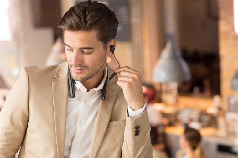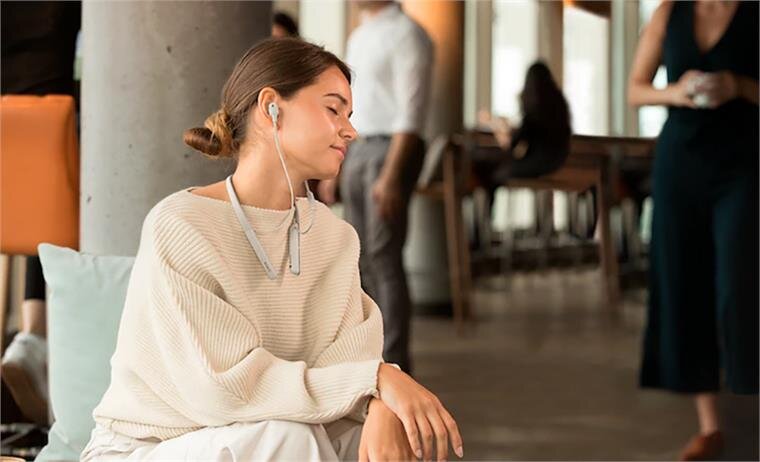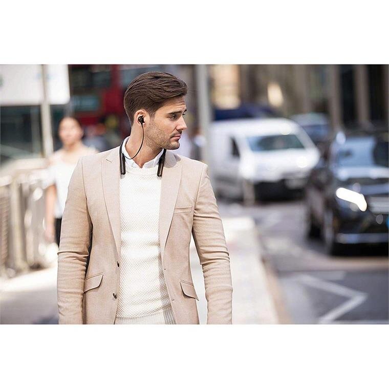 Không những thế, phần đeo ở cổ cũng được làm từ vật liệu silicon mềm, đàn hồi hạn chế được cảm giác đau hay vướng víu khi đeo lên cổ. Cụm phím điều khiển của tai nghe bao gồm phím tăng/giảm âm lượng, phím dừng/chơi nhạc và một phím nghe gọi được đặt ở bên trái giúp thuận tiện cho người dùng thao tác. Sản phẩm này cũng được tặng kèm theo một hộp đựng tai nghe đi kèm theo ngăn đựng một số phụ kiện như một dây sạc USB – C, một dây chuyển jack 3.5mm để khi nghe có dây và một jack cắm để nghe khi đi máy bay.