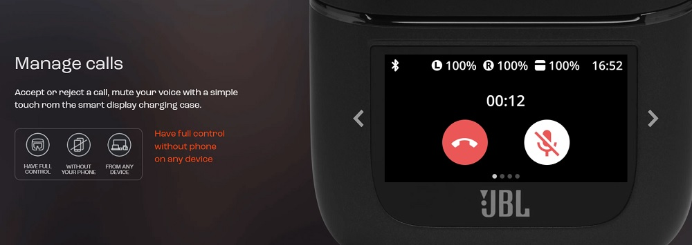 Với màn hình cảm ứng nhỏ gọn chỉ rộng 1.45 inch này, người dùng có thể đọc tin nhắn, trả lời cuộc gọi, điều khiển các chức năng chống ồn, chống rung, xuyên âm,... Không cần phải dùng điện thoại nữa, hầu hết tính năng đã được tích hợp trên màn hình thông minh của JBL Pro Tour 2 đảm bảo phục vụ đủ các nhu cầu cơ bản của bạn với một đôi tai nghe Bluetooth.