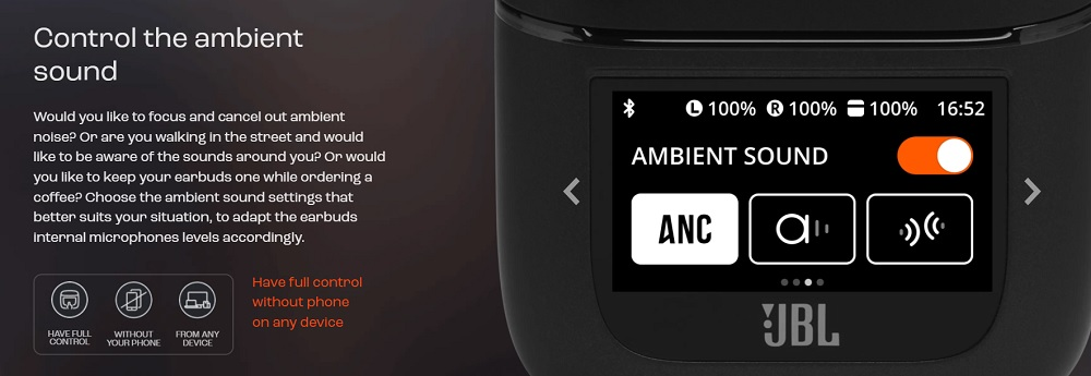 JBL gọi chiếc tai nghe này là Smart True Wireless, vì chiếc màn hình cảm ứng ở trên hộp sạc có thể hoạt động độc đáo hệt như một chiếc đồng hồ đeo tay hay vòng đeo tay thông minh.