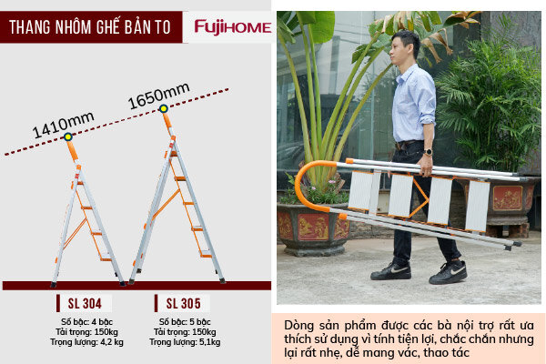 SL-304 được thiết kế bởi nhôm siêu nhẹ, không chỉ các đấng mày râu mà chị em phụ nữ sử dụng một cách đơn giản Thang ghế 4 bậc FUJIHOME SL-304 có vỏ thùng carton đựng thang cẩn thận, hạn chế bị trầy xước khi di chuyển, cũng như có tem nhãn mác không như các thang trôi nổi trên thị trường hiện nay.
