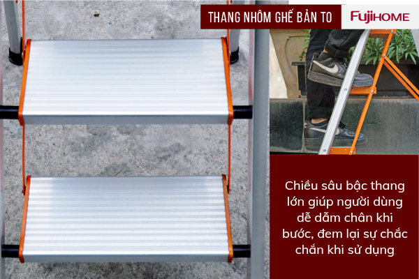 Các bậc thang được thiết kế bản to nên chắc chắn cho bước chân của bạn không lo bị trượt ngã. Bậc thang được làm bằng nhôm dầy chịu được lực nặng, chống móp méo, hay cong vênh.