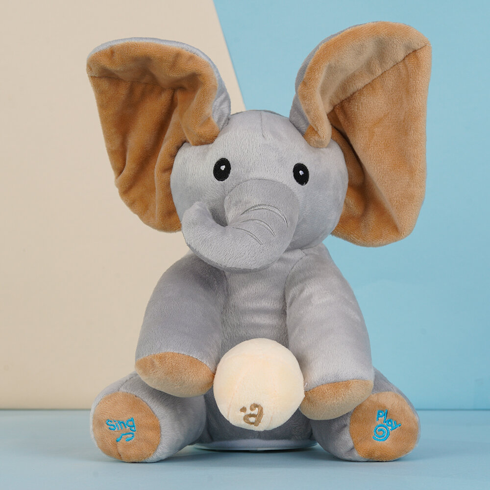 . Lắp pin vào sản phẩm, sau đó nhấn nút ở chân, chú voi sẽ hát và chơi ú òa.