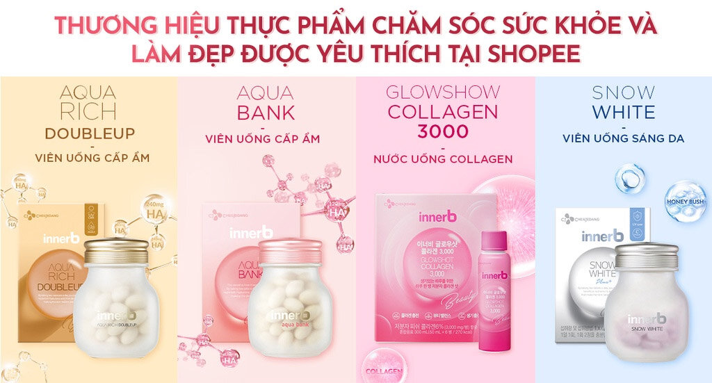 Thực Phẩm Bảo Vệ Sức Khỏe InnerB là dòng sản phẩm  dạng viên uống đến từ  - thương hiệu trực thuộc CJ CheiJedang - công ty con của Tập đoàn CJ chuyên sản xuất và kinh doanh mặt hàng thực phẩm bằng ứng dụng công nghệ sinh học. Viên uống InnerB giúp bổ sung các thành phần dưỡng chất thiết yếu cho sức khoẻ và làn da như Hyaluronic Acid, Collagen, Vitamin C,... từ đó cải thiện và chăm sóc làn da từ sâu bên trong, mang đến cho bạn một làn da mịn mượt, căng mướt và khỏe mạnh.