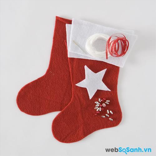 Nguyên liệu: vải dạ trắng, xanh, đỏ, cúc áo màu, dây ruy-băng xanh, kéo, kim khâu, chỉ màu, mẫu chiếc tất