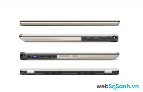 Bên cạnh phải của máy, bạn sẽ thấy có hai cổng USB 3.0, một cổng HDMI, một khe đọc thẻ SD, một khe khóa Kensington và nút nguồn của máy. Cạnh bên trái có một cổng USB 2.0, jack tai nghe kiêm mic, jack cắm sạc, nút điều chỉnh âm lượng và nút Window Start.