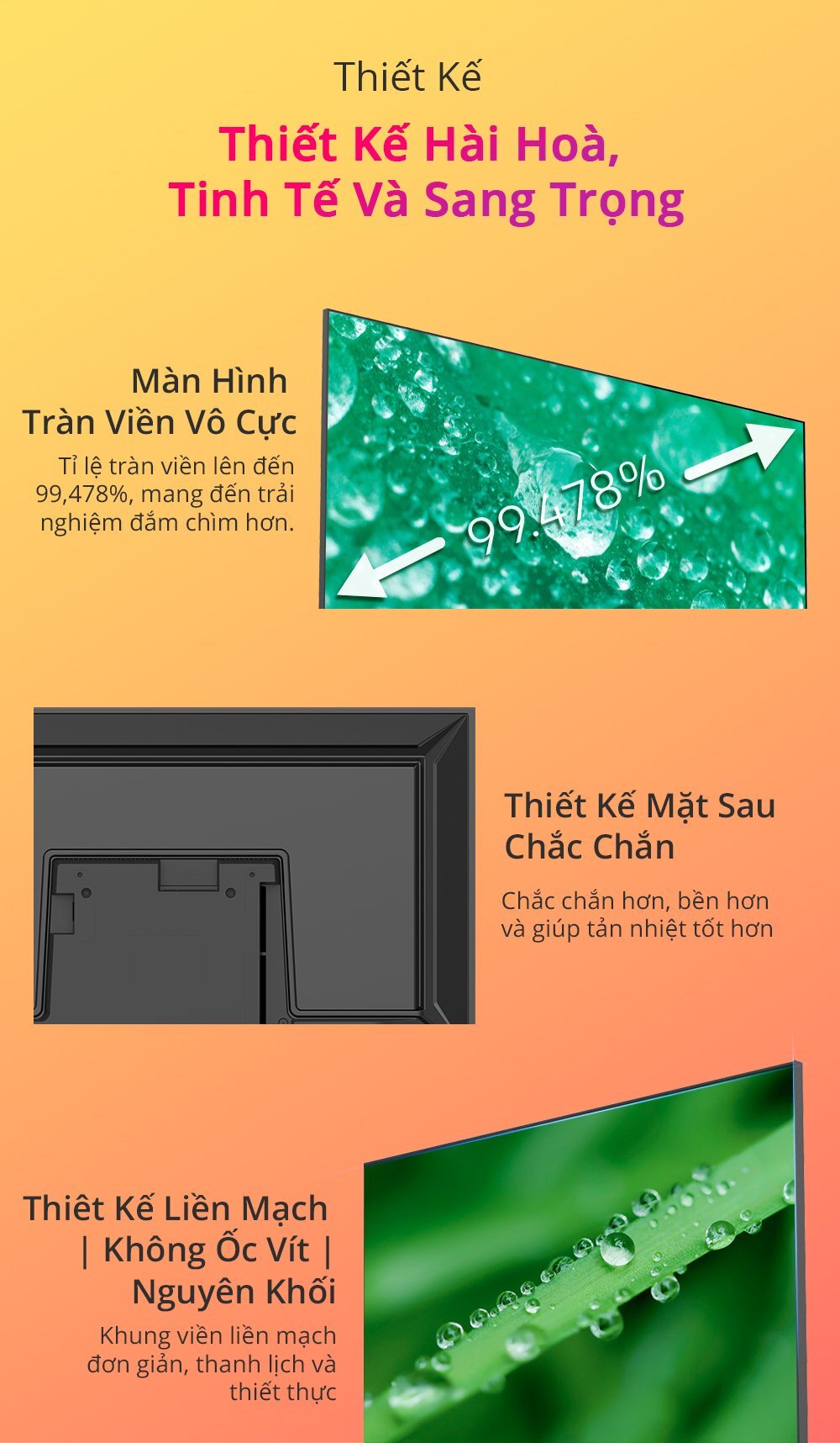 Màn hình tràn viền: Giới hạn giữa tivi với không gian đời thực dường như bị xóa nhòa với màn hình tràn viền 4.0. Đồng thời, màn hình tràn viền giúp chiếc tivi trở nên đẹp mắt và sành điệu hơn.