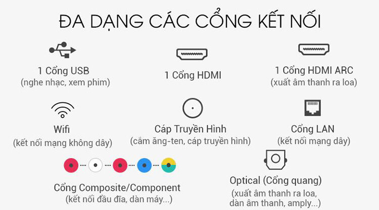 HDMI: Kết nối tivi với laptop, pc, dàn âm thanh để trình chiếu các nội dung hình ảnh, phim, ca nhạc.