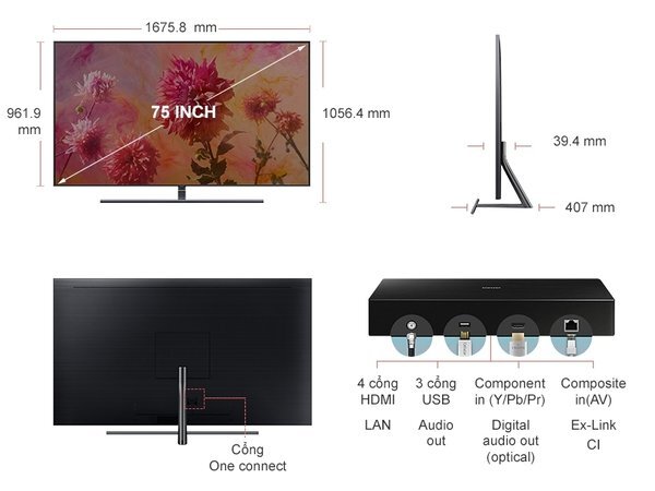 Smart Tivi QLED 4K UHD Samsung 75 inch 75Q9FN sở hữu thiết kế mỏng hiện đại với màn hình phẳng sang trọng, viền màn hình siêu mảnh mang đến cảm giác trải nghiệm hình ảnh tràn viền sống động. Chân đế được thiết kế chắc chắn, cho phép tivi có thể đứng vững trên nhiều chất liệu mặt phẳng khác nhau như: Gỗ, kính, thảm, kim loại,...