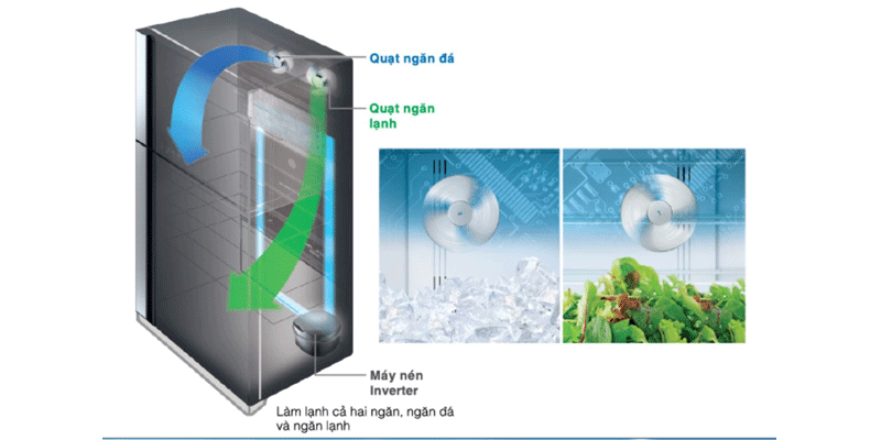 Hệ thống quạt kép, một cho ngăn lạnh, một cho ngăn đá, giúp từng ngăn bên trong tủ được làm lạnh một cách độc lập. Không như những loại tủ lạnh thông thường khác chỉ sử dung một quạt, tùy vào điều kiện nhiệt độ, không khí lạnh sẽ được cung cấp cho ngăn lạnh, hoặc cho ngăn đá, hoặc cho cả 2 ngăn. Hơn thế nữa , hệ thống quạt kép điều chỉnh lưu lượng không khí thậm chí mạnh và hiệu quả hơn tùy vào cài đặt.
