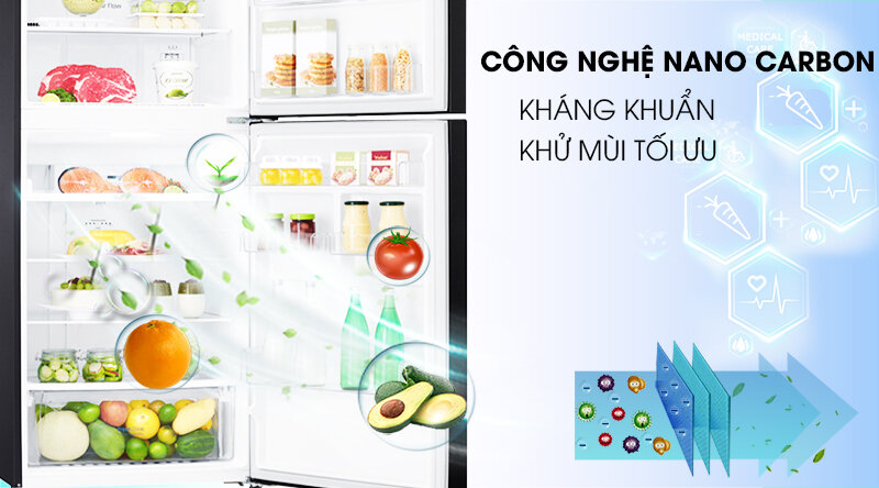 Tủ lạnh LG Inverter này còn được trang bị công nghệ Nano Carbon, có khả năng diệt khuẩn cũng như loại bỏ mùi hôi hiệu quả, giúp kéo dài thời gian bảo quản thực phẩm và giữ cho không khí bên trong tủ luôn được thoáng mát, dễ chịu.