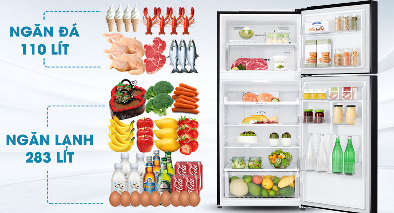 Với dung tích 393 lít, trong đó ngăn đá 110 lít và ngăn mát 283 lít, là một trong những mẫu tủ lạnh phù hợp dành cho các hộ gia đình có khoảng 3 đến 4 thành viên sử dụng.