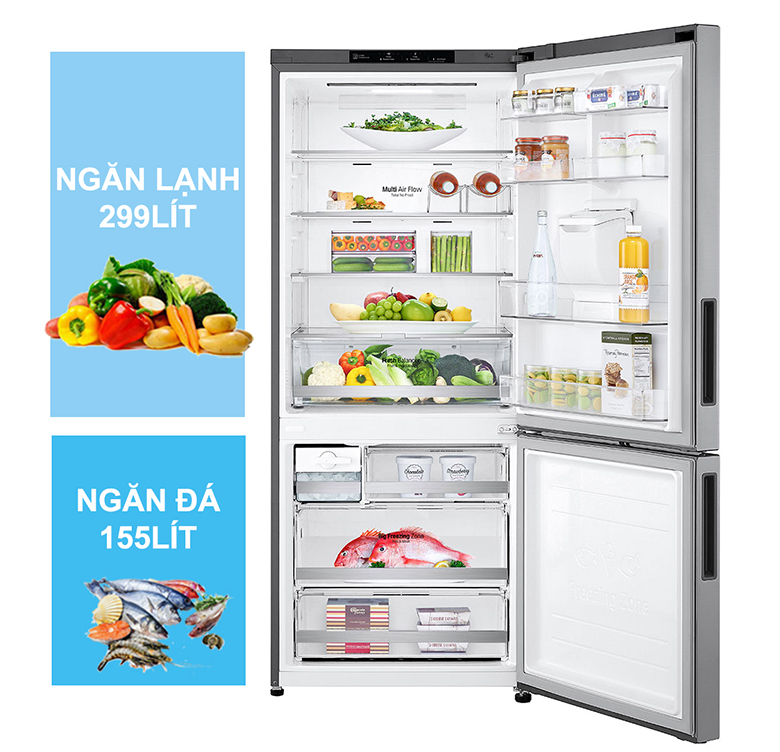 Tủ lạnh 2 cửa LG Inverter GR-D405PS có dung tích sử dụng lớn lên đến , trong đó ngăn lạnh 299L, ngăn đông 155L. Các ngăn tủ được bố trí hợp lý, ngăn đông thiết kế 3 ngăn kéo, ngăn lạnh có 6 giá đỡ cố định ở cửa, 1 ngăn kéo rau củ, 4 khay đỡ với 1 khay cố định và 3 khay tùy chỉnh giúp bạn dễ dàng sắp xếp thực phẩm một cách gọn gàng, khoa học nhất nhất. Dung tích lớn cung cấp thực phẩm tươi ngon sẵn sàng cho cả gia đình 5-7 người.