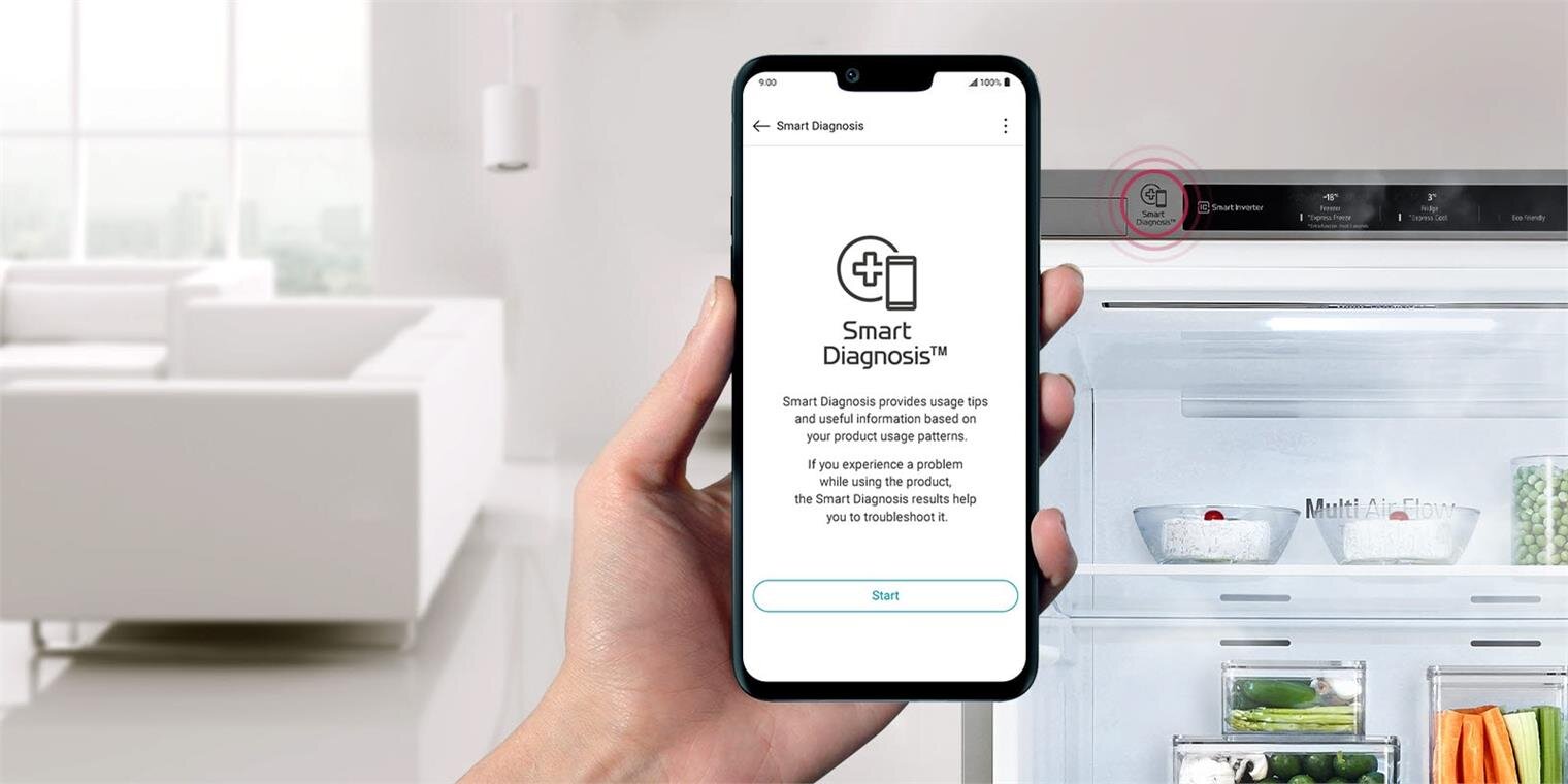Dừng video Smart Diagnosis Giữ cho bạn một bước đi trước Khắc phục sự cố nhỏ và cập nhật cảnh báo bảo trì để bạn có thể tránh gặp rắc rối khi gọi dịch vụ. * Yêu cầu điện thoại thông minh tương thích, yêu cầu Android 4.1.2 (JellyBean) trở lên hoặc iOS 9 trở lên cho ứng dụng LG ThinQ®. (Chức năng NFC không hoạt động trong iOS) * Tìm kiếm ứng dụng LG ThinQ từ Google Play Store hoặc Apple App Store trên điện thoại thông minh. Làm theo hướng dẫn để tải xuống và cài đặt ứng dụng. * Thiết bị chỉ hỗ trợ mạng Wi-Fi 2,4 GHz. Để kiểm tra tần số mạng của bạn, hãy liên hệ với nhà cung cấp dịch vụ Internet hoặc tham khảo hướng dẫn sử dụng bộ định tuyến không dây của bạn. * Để biết chi tiết, vui lòng tham khảo hướng dẫn sử dụng của chủ sở hữu.
