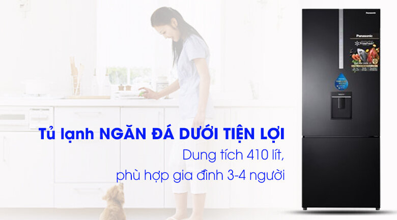 Với tủ lạnh dung tích 410 lít, sản phẩm phù hợp với gia đình từ 3 – 4 người. Đồng thời thiết kế tủ lạnh ngăn đá ở phía dưới cho người dùng sử dụng tiện lợi hơn, cũng là một nét độc đáo làm nổi bật căn bếp của bạn.