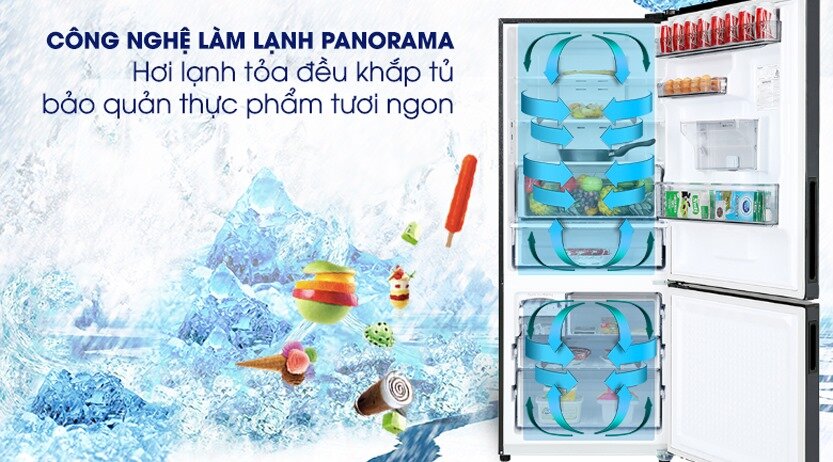 Ngay cả khi thực phẩm bị cất trong ngóc ngách của tủ lạnh thì hệ thống khí lạnh đa chiều vẫn mang hơi lạnh đến tận nơi, giúp thực phẩm nhận được hơi lạnh thích hợp, bảo quản được lâu trong thời gian dài.