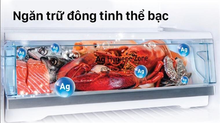 *Hình ảnh chỉ mang tính chất minh họa Duy trì độ tươi ngon và chất dinh dưỡng thịt cá nhờ ngăn trữ đông Ag Hygiene Zone Việc bảo quản thực phẩm tươi sống, nhất là thịt và cá sẽ trở nên hoàn hảo hơn trong ngăn trữ đông tinh thể bạc (còn gọi là ngăn Ag Hygiene Zone). Vì tinh thể bạc Ag+ có khả năng khử vi khuẩn hiệu quả, nhờ đó hàm lượng chất dinh dưỡng và độ tươi ngon của thịt cá sẽ được duy trì tối ưu, góp phần giữ được hương vị tươi ngon cho món ăn.