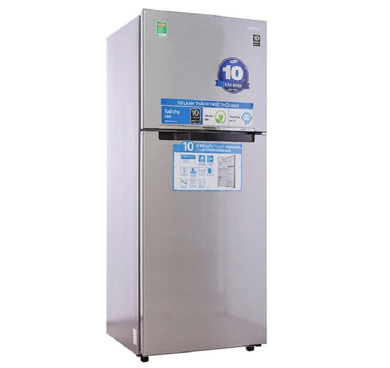 Tủ lạnh Samsung có thiết kế 2 cửa quen thuộc với ngăn đá được đặt ở trên dễ sử dụng. Tủ có chiều cao tổng thể là 178 cm, không quá cao với phần tay cầm để mở tủ ở vừa tầm nên các thành viên có chiều cao khác nhau trong gia đình đều có thể dễ dàng sử dụng. Bề mặt ngoài của tủ lạnh được phủ một lớp sơn tĩnh điện giúp tạo được sự sang trọng cũng như khả năng khó bám bẩn và dễ vệ sinh (nếu vô tình bị bám bẩn chỉ cần dùng khăn lau nhẹ là có thể xóa sạch vết dơ).
